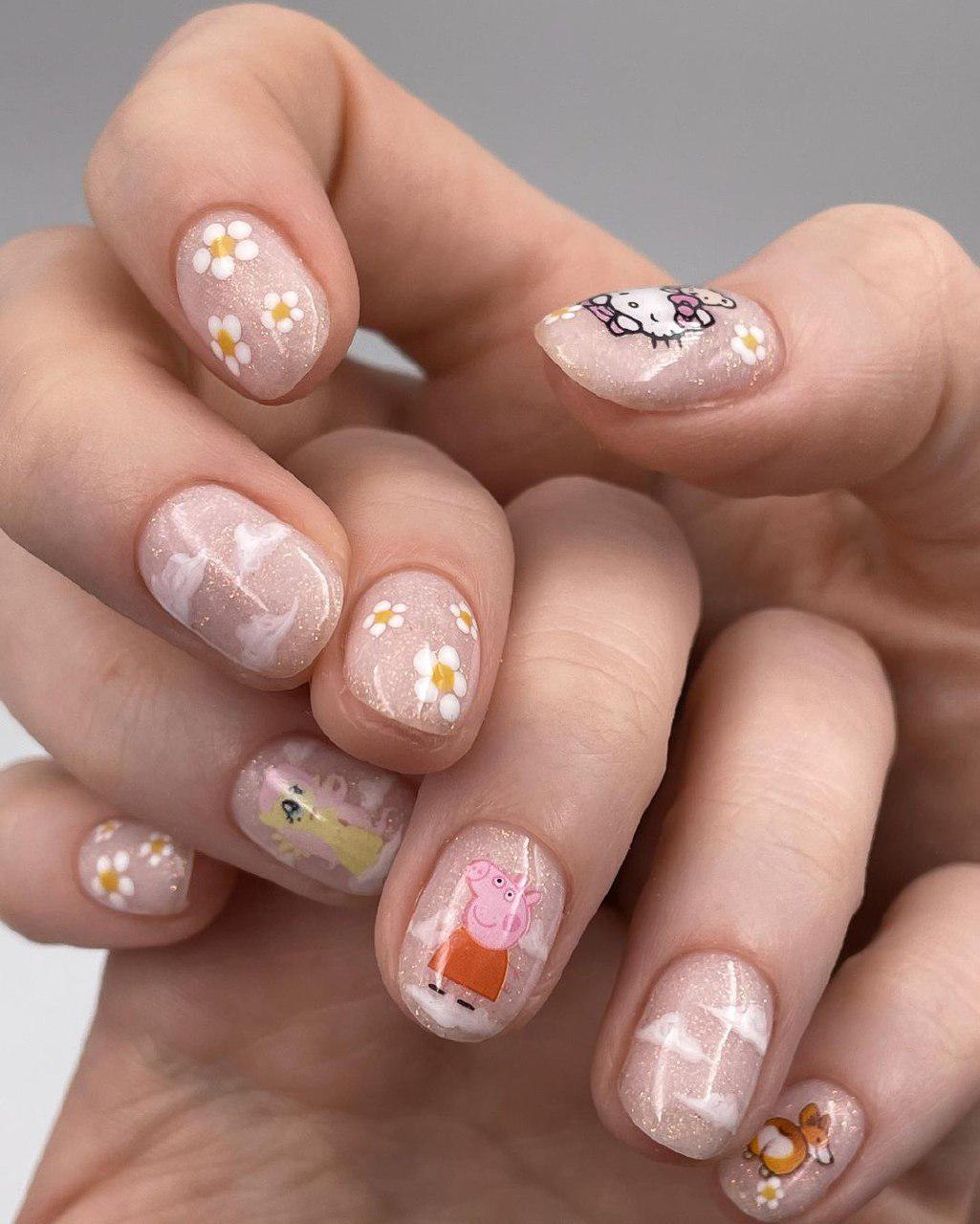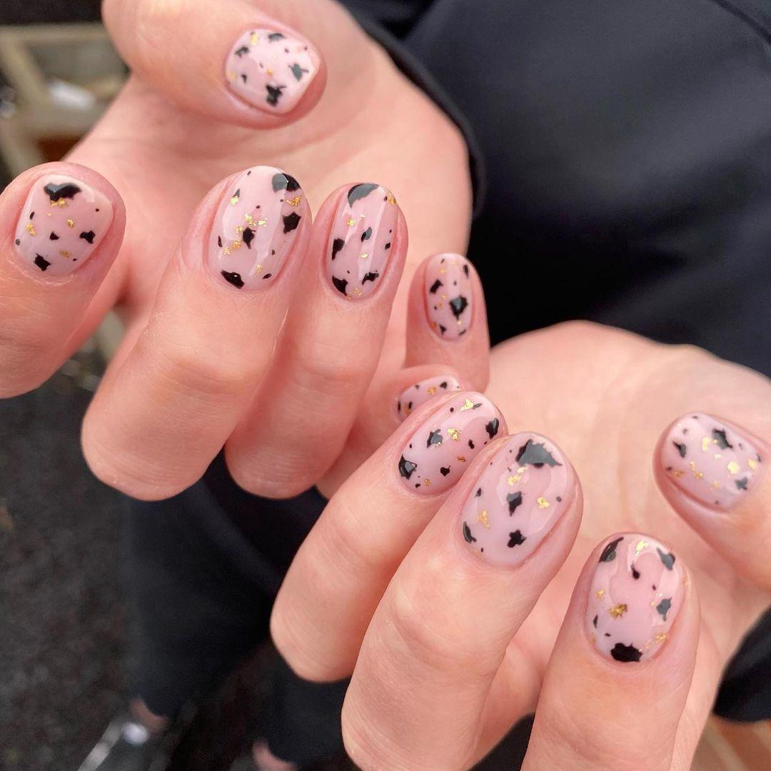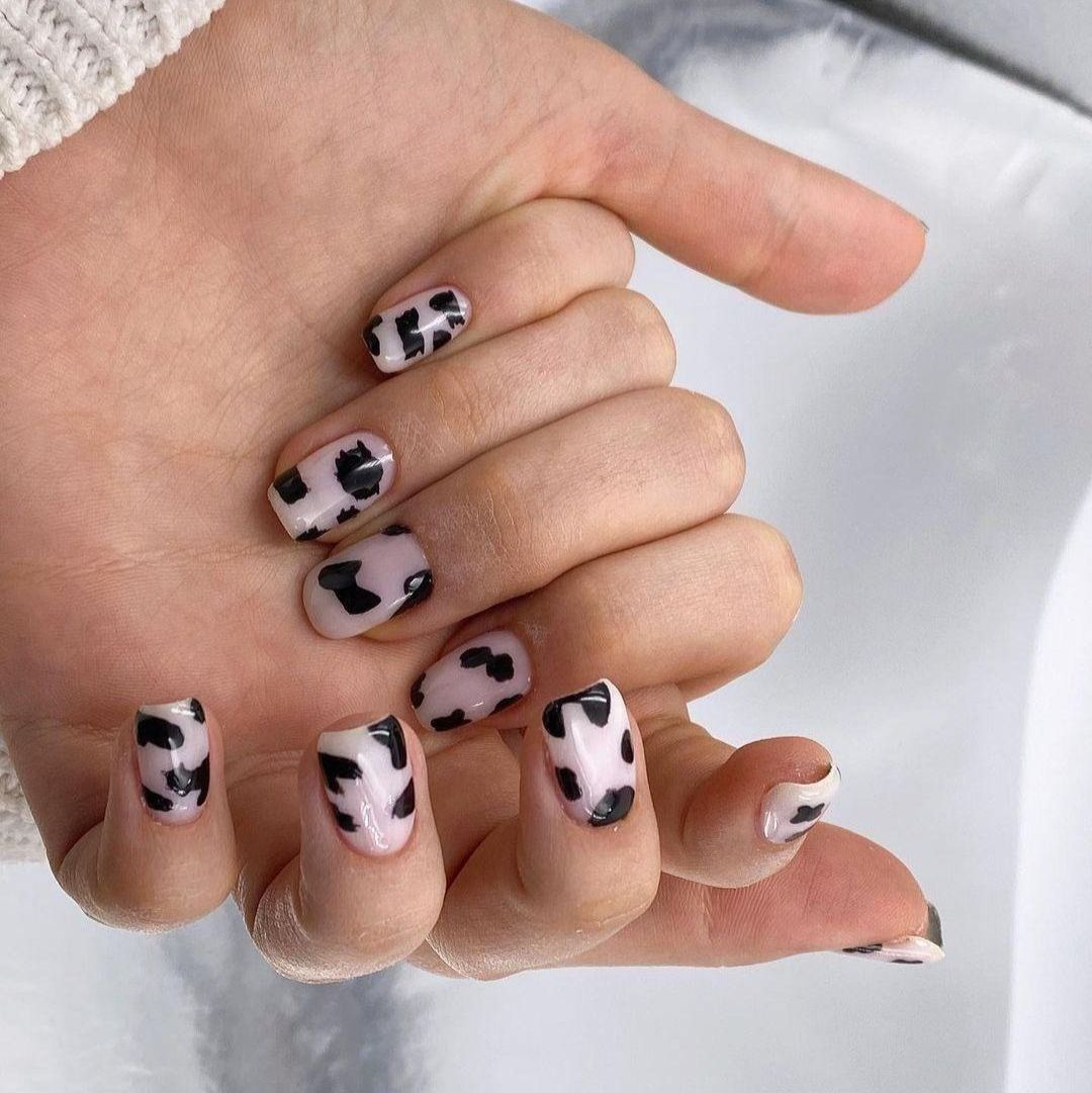 Тренд на «пятнистый» маникюр держится уже пару лет, но в 2021 он прочно обосновался среди самых актуальных. При чем пятнышки могут быть любыми – от имитации животного окраса (коровы, жирафа, леопарда) до равномерно распределенных по площади ногтя эмоджи. Лучше всего такой дизайн выглядит на нейтральном фоне – прозрачном или бежевом.