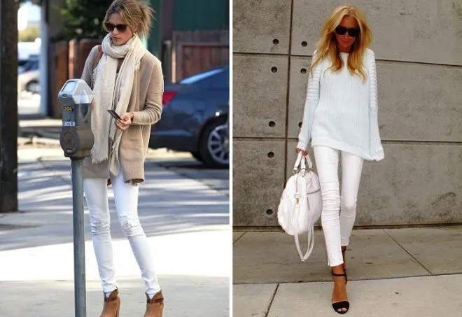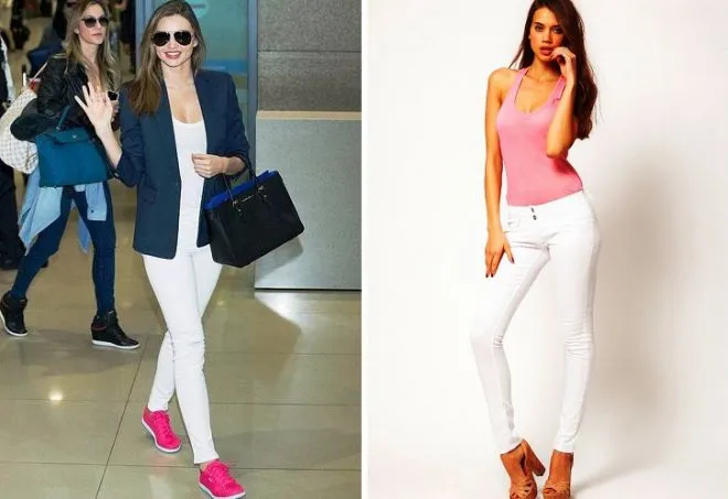 - Белые джеггинсы, как и синие, можно носить с самыми разными цветами, но чтобы не было скучно, рекомендуется наполнить их яркими элементами.