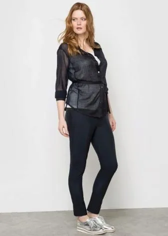 Середину джеггинсов лучше скрыть, поэтому верх должен доходить хотя бы до середины бедер. Короткая футболка, которая вытягивает пояс джеггинсов, будет выглядеть грубо и вульгарно.