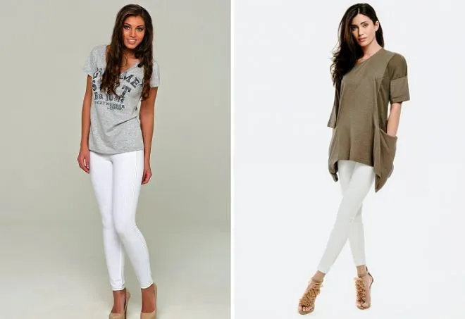 Топ с белыми или очень светлыми джеггинсамиВы можете выбрать рубашки, блузки, кофты или футболки темных или светлых оттенков. Они также очень хорошо сочетаются с отпечатками. Если девушка выбирает монохромные элементы в своем гардеробе, к таким образам неизбежно должны быть добавлены яркие аксессуары, чтобы не выглядеть скучно и уныло. Отлично подойдет броская сумка, шейный платок с оригинальным дизайном или большое блестящее украшение.