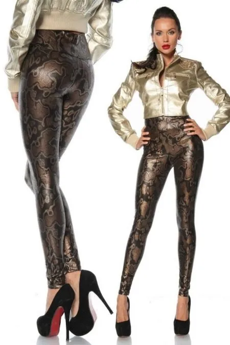Брюки из тонкой кожи выглядят очень необычно и привлекательно, но лучше всего носить их с тонким силуэтом. Кроме того, эти брюки следует доставать из шкафа холодной осенью или зимой, так как в жаркие дни в них может быть очень жарко. В остальном кожаные джеггинсы с высокой талией ничем не отличаются от других видов подобных брюк. По общему принципу они должны сочетаться с обувью и верхом.